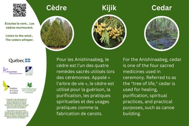For the Anishinaabeg, kijik (cedar) is one of the four sacred medicines used in ceremony. Referred to as the "tree of life," cedar is used for healing, purification, spiritual practices, and practical purposes, such as canoe building and fire starting.
