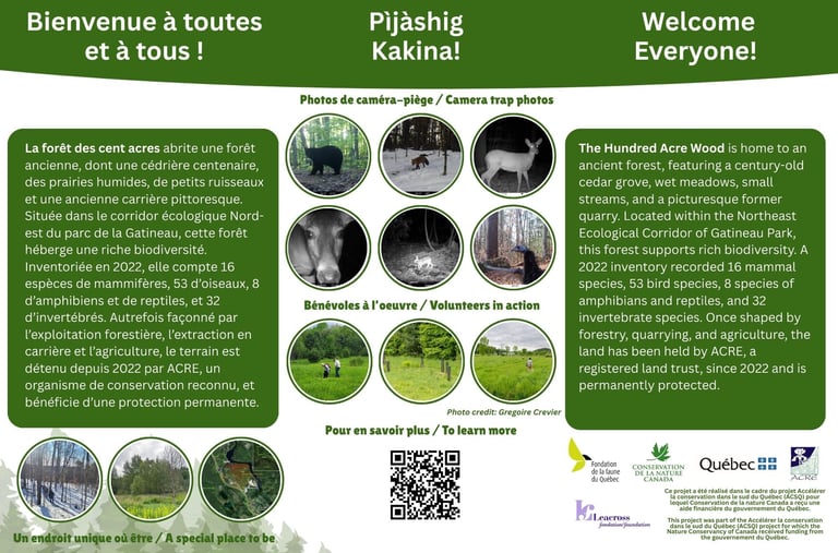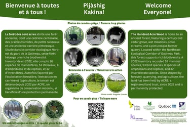 This enchanting place with the total area of 40,5 ha is home to an ancient forest, featuring a century-old cedar grove, wet meadows, small streams, and a picturesque former quarry, which was used to extract diopside. Located within the Northeast Ecological Corridor of Gatineau Park, the Hundred Acre Forest supports rich biodiversity. A 2022 inventory recorded 16 mammal species, 53 bird species, 8 species of amphibians and reptiles, and 32 invertebrate species. Once shaped by forestry, mining, and agriculture, the land has been owned by ACRE, a registered land trust, since 2022 and is now permanently protected as a natural voluntary conservation environment. A stewardship committee made up of engaged and knowledgeable local residents plays an active role in managing the forest alongside ACRE in accordance with the forest management plan.