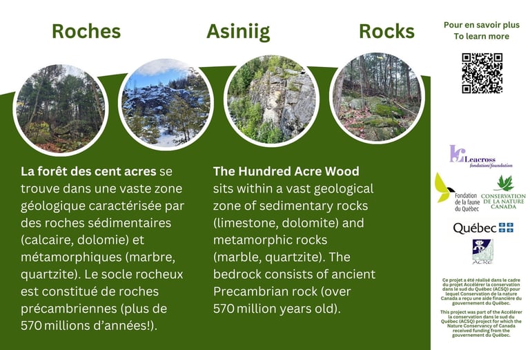 The Hundred Acre Wood (HAW) is part of the Grenville geological province, a region characterized by sedimentary rocks such as marble, calc-silicate rocks, dolomite, shale, and quartzite. The underlying Canadian Shield is primarily composed of granite along with some metamorphosed igneous rocks. The bedrock consists of Precambrian rocks (over 570 million years old), made up of igneous and metamorphic rocks, on which the other geological units were deposited. The HAW is located at an elevation ranging from 150 to 200 m above sea level, and its terrain is characterized by numerous hills.